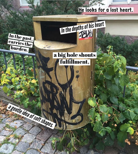 The artwork explores authorship through filming and texts. The illustrations that fit into everyday life create new meanings. The details, the street and nature embody Mira Mink's urban art.