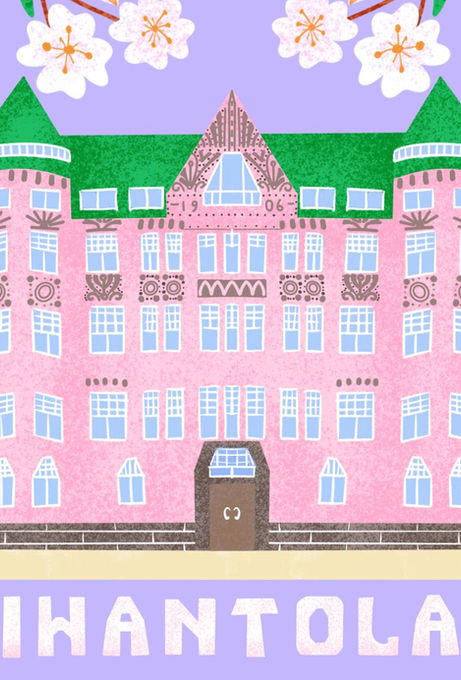 Olga Mezhevich (b. 1987) is a visual artist creating digital illustrations as well as acrylic paintings (working under the artistic name Olga Illustrates). Olga has a special interest in depicting Art Nouveau architecture of Helsinki in her art. She became interested in architecture while working as a guide in the city and thinks that Helsinki has the most unique interpretation of Art Nouveau style of all. Moreover, Helsinki has cozy neighbourhoods with colourful wooden houses surrounded by gardens, such as Puu-Käpylä, Puu-Vallila and Puu-Tapanila, which also inspire Olga. She strives to create a sense of warmth and coziness with her artworks by using cheerful colours and cute elements. Olga also experiments with other techniques such as Fluid Art and collage art.